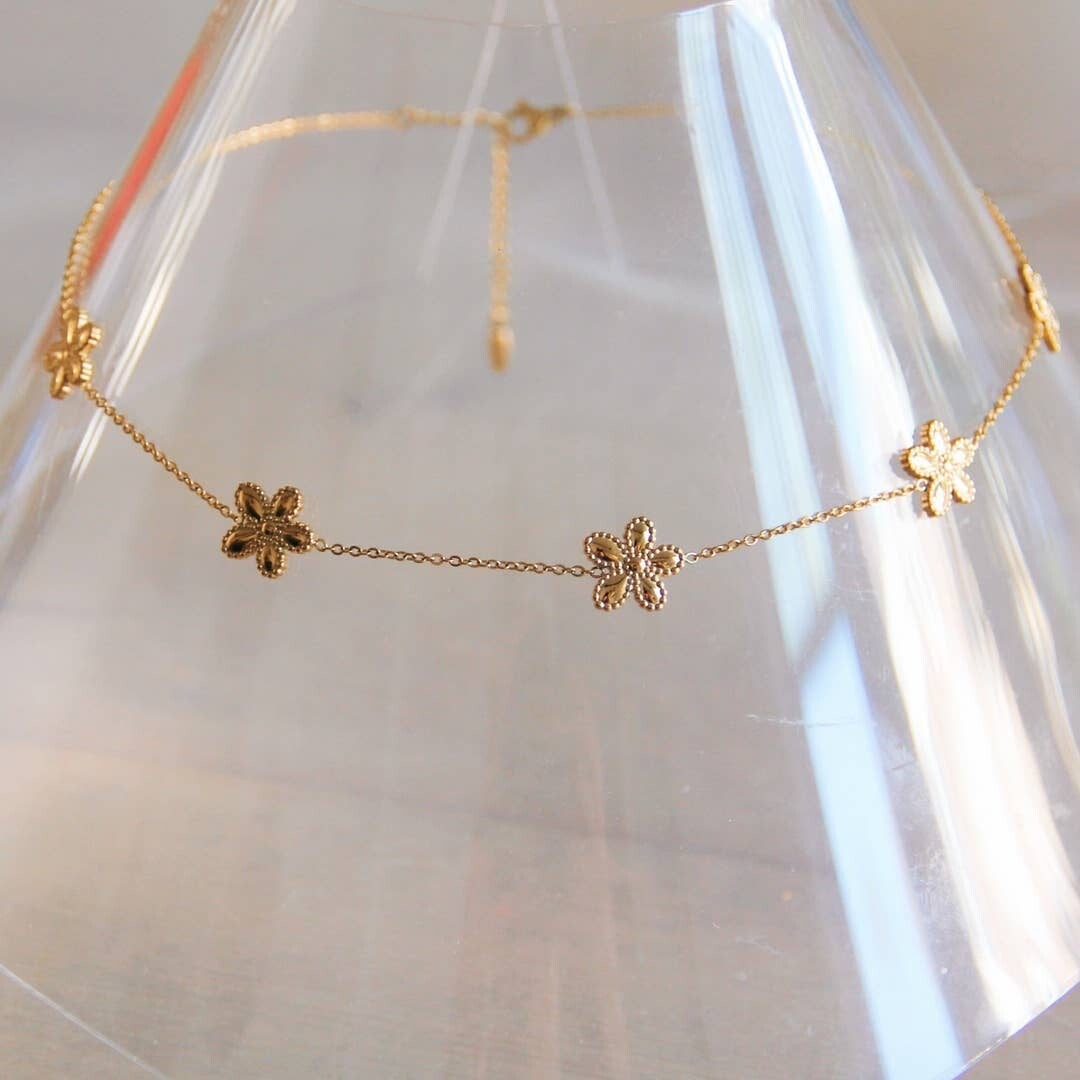 Fijne ketting van roestvrij staal met 5 bloemen - goud